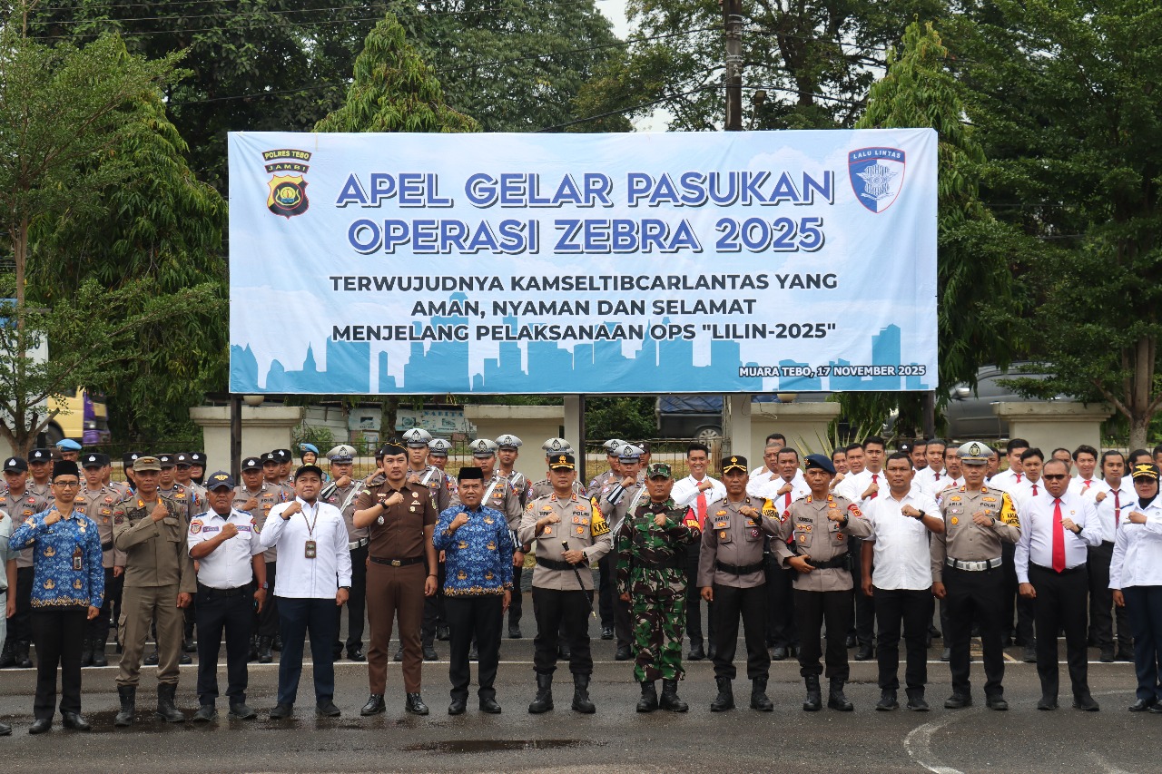 Polres Tebo menggelar Apel Pasukan Operasi Zebra Siginjai 2025 pada Senin, 17 November 2025, di Lapangan Apel Polres Tebo. Kegiatan yang dimulai pukul 07.45 WIB ini dipimpin langsung oleh Kapolres Tebo AKBP Triyanto, S.I.K., S.H., M.H., dan dihadiri Forkopimda Kabupaten Tebo, Pj. Sekda Dr. Sindi, S.H., M.H., pejabat OPD terkait, PJU Polres Tebo, serta unsur TNI, Brimob, dan instansi pendukung lainnya.