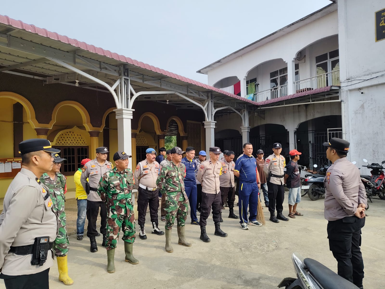 Rangkaian kegiatan diawali dengan apel bersama, penyampaian arahan, pembacaan doa, kemudian dilanjutkan dengan aksi gotong royong membersihkan area mesjid dan lingkungan sekitar.