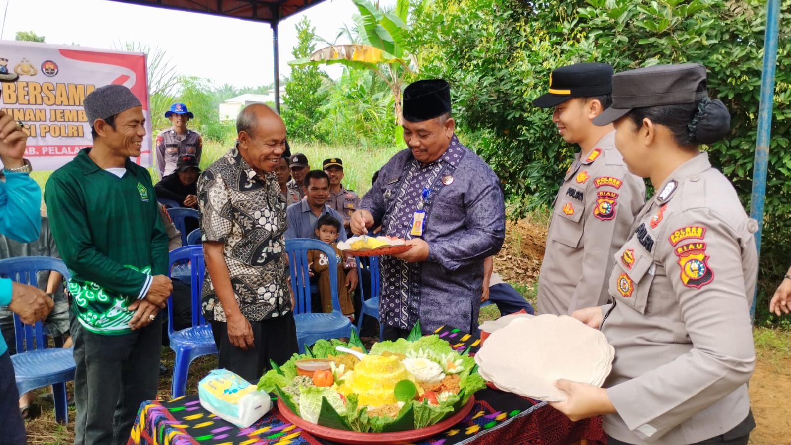 Rangkaian acara dimulai dengan pembukaan MC, sambutan Camat Ukui, sambutan Kapolsek Ukui, doa bersama dipimpin Ustad Heri, ucapan terima kasih perwakilan warga oleh Sdr. Darlis, pemotongan tumpeng keberkahan oleh Upika Kecamatan Ukui, dan makan bersama. Usai doa, kegiatan langsung dilanjutkan dengan pengerjaan fisik jembatan.