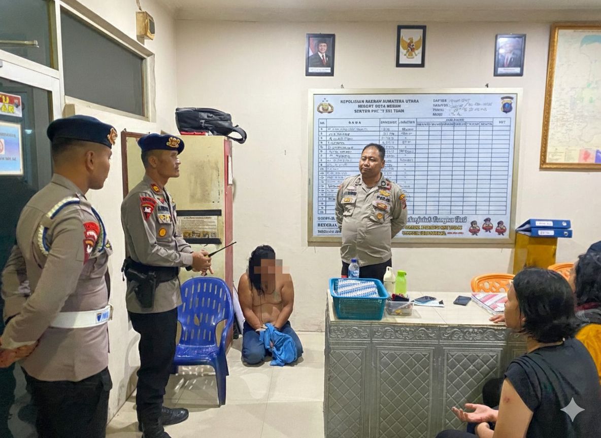 Personel Satuan Brimob Polda Sumatera Utara bertindak cepat menanggapi Laporan Masyarakat terkait Tindak Pidana Penganiayaan dan Kekerasan Dalam Rumah Tangga (KDRT) yang terjadi di Jalan Sukaria, Kelurahan Indra Kasih, Kecamatan Medan Tembung, Kabupaten Deli Serdang, Jumat (24/10/2025), malam.