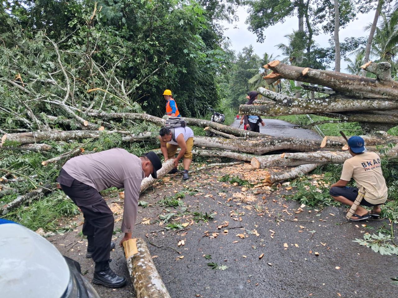 Pohon berukuran besar tersebut tumbang akibat faktor alam dan sempat menutup sebagian badan jalan, sehingga menghambat akses serta aktivitas masyarakat yang melintas di jalur tersebut.