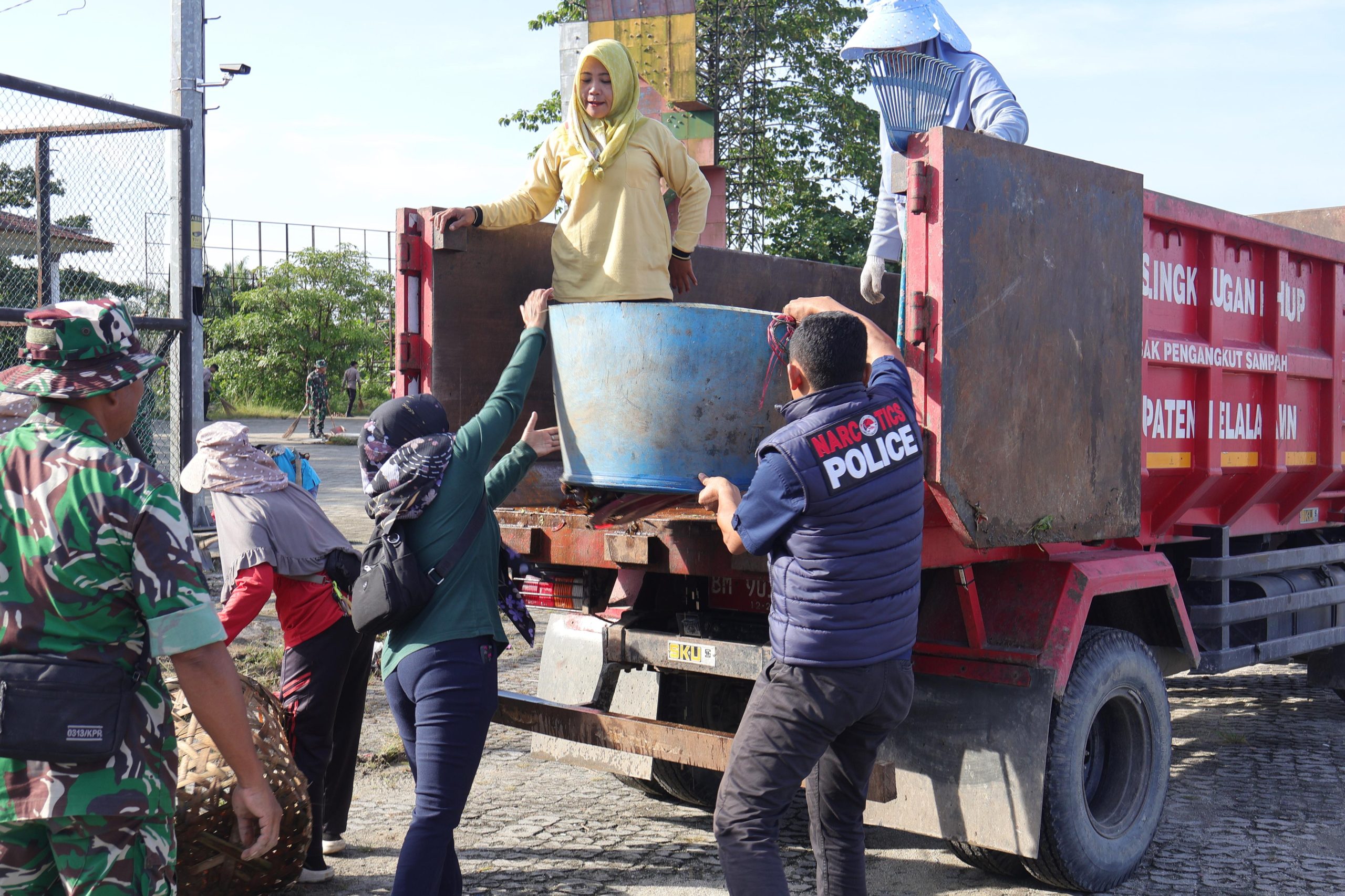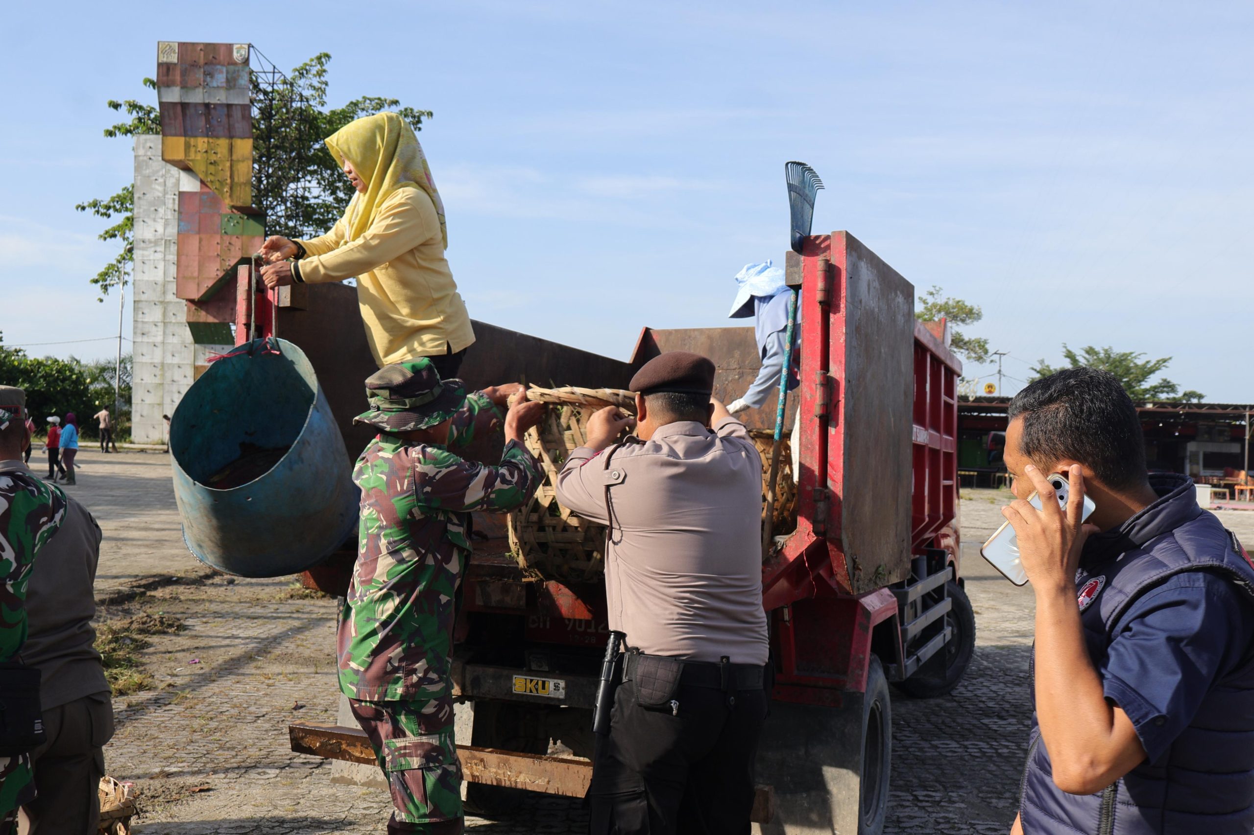 Sejak pukul 07.30 WIB, personel gabungan langsung menyisir sampah di kawasan Ruang Publik Kreatif. Berbekal 1 unit truck sampah DLH, angkong, sapu lidi, serokan sampah, cangkul, dan peralatan kurvei lainnya, mereka membersihkan taman, jalur pejalan kaki, dan saluran air. Semangat gotong royong terlihat saat Polri, TNI, dan ASN bahu-membahu mengangkat sampah.