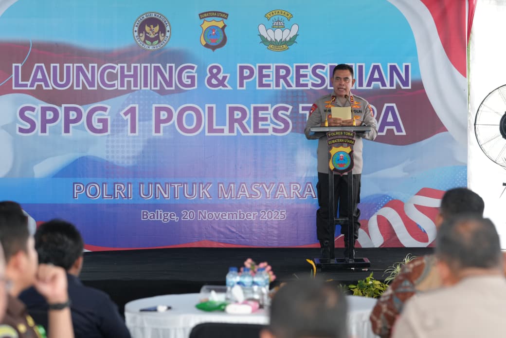 Mendukung Program Makan Bergizi Gratis (MBG), Kapolda Sumut, Irjen Pol Whisnu Hermawan Februanto, S.IK., MH., didampingi Ketua Bhayangkari Daerah Sumut, Ny. Mona Whisnu, meresmikan Satuan Pelayanan Pemenuhan Gizi (SPPG) atau Dapur Makan Bergizi Gratis Polres Toba, di Jalan Patuan Nagari No. 101, Balige, Kabupaten Toba, Kamis (20/11/2025).