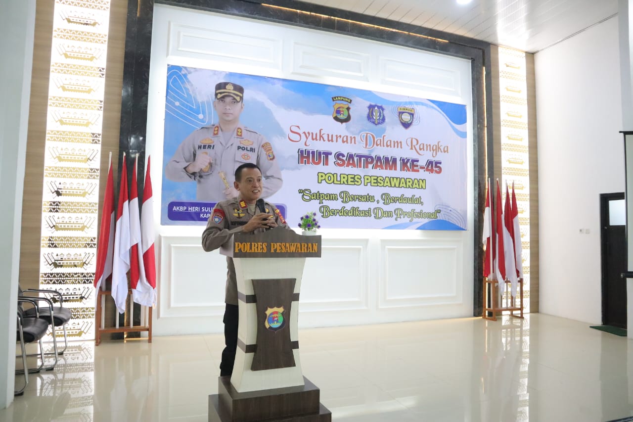 Polres Pesawaran menggelar kegiatan syukuran dalam rangka memperingati Hari Ulang Tahun (HUT) Satuan Pengamanan (Satpam) ke-45 Tahun 2025, yang berlangsung khidmat dan penuh kebersamaan di Aula Pamor Persada Polres Pesawaran, Rabu (7/1/2026).