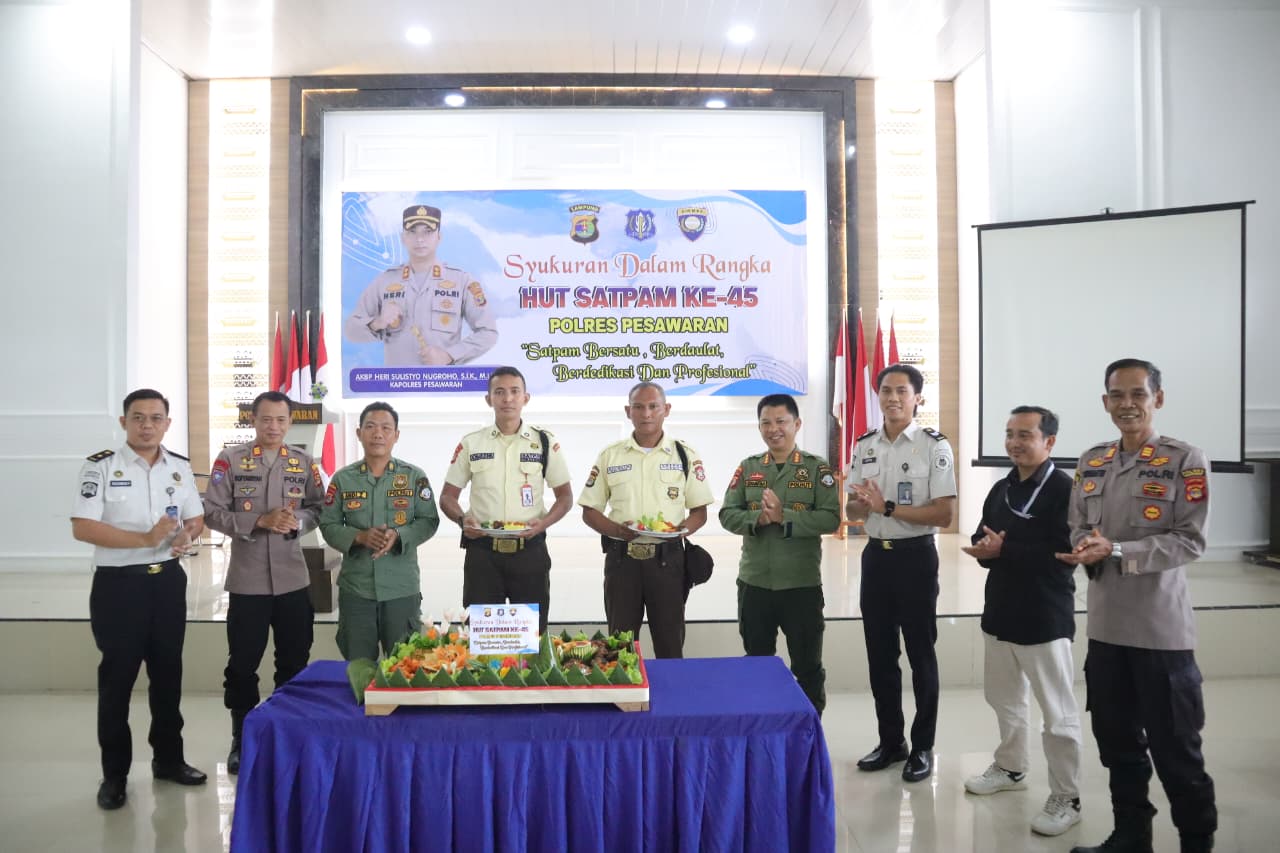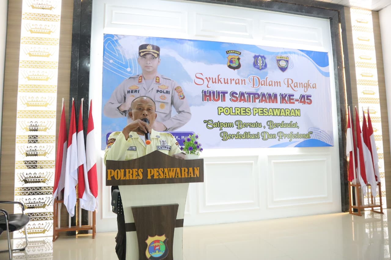 Polres Pesawaran menggelar kegiatan syukuran dalam rangka memperingati Hari Ulang Tahun (HUT) Satuan Pengamanan (Satpam) ke-45 Tahun 2025, yang berlangsung khidmat dan penuh kebersamaan di Aula Pamor Persada Polres Pesawaran, Rabu (7/1/2026).